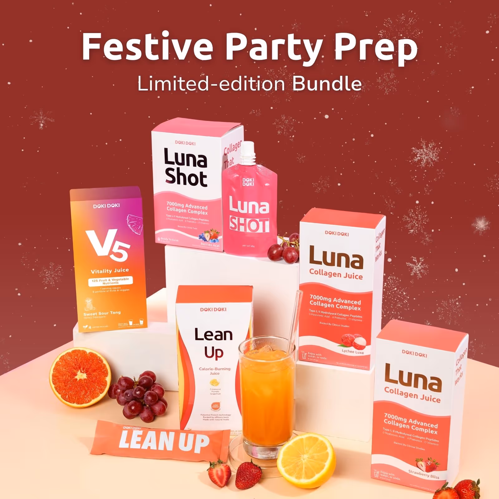This limited-edition Festive Party Prep Bundle is filled with Doki favourites — Lean Up, Luna Collagen and V5 Vitality Juice — crafted to impress and made for sharing at every gathering.