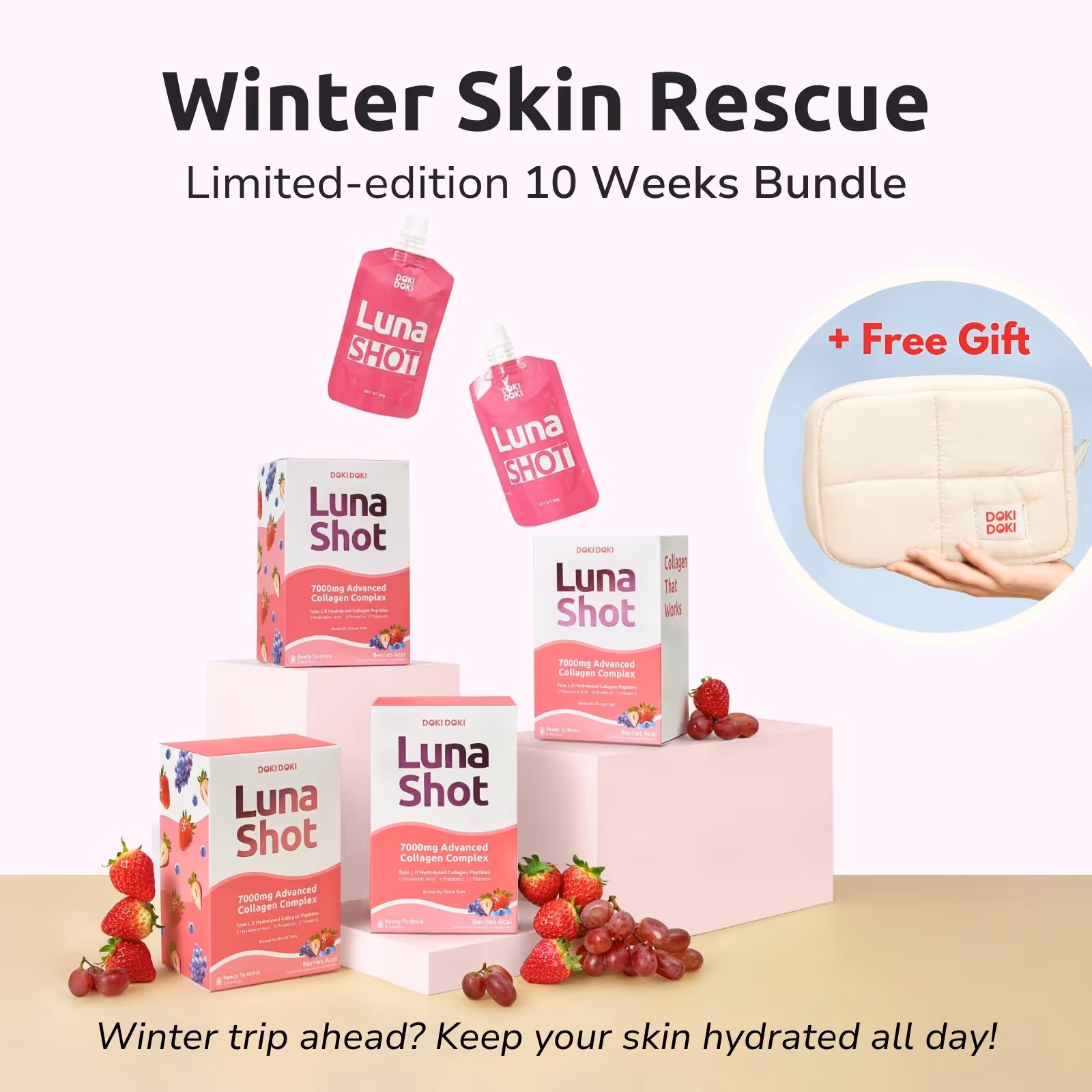 Meet your winter travel skin essential. Luna Shot Collagen keeps your skin hydrated and smooth in cold weather — plus a Doki Cloud Puffer Pouch for all your winter essentials (while stocks last).